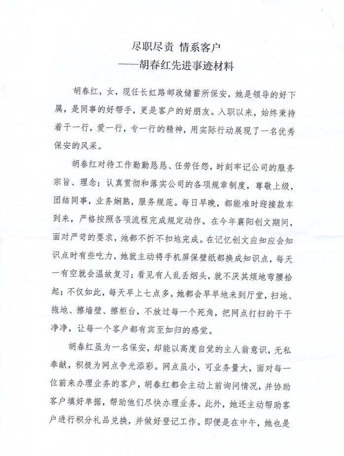 胡春紅,女,現(xiàn)任長虹路郵政儲蓄所保安,她是領(lǐng)導(dǎo)的好下屬,是同事的好幫手,更是客戶的好朋友。入職以來,始終秉持著干一行,愛一行,專一行的精神,用實(shí)際行動展現(xiàn)了一名優(yōu)秀保安的風(fēng)采。胡春紅對待工作勤勤懇懇、任勞任怨,時刻牢記公司的服務(wù)宗旨、理念;認(rèn)真貫徹和落實(shí)公司的各項規(guī)章制度,尊敬上級,團(tuán)結(jié)同事,業(yè)務(wù)嫻熟,服務(wù)規(guī)范。每日早晚,都能準(zhǔn)時迎接款車到來,嚴(yán)格按照各項流程完成規(guī)定動作。在今年襄陽創(chuàng)文期間,面對嚴(yán)苛的要求,地都不折不扣地完成。在記憶創(chuàng)文應(yīng)知應(yīng)會知識點(diǎn)時有些吃力,她就主動將手機(jī)屏保壁紙都換成知識點(diǎn),每天有空就會溫故復(fù)習(xí):看見有人亂丟煙頭,就不厭其煩地彎腰拾起;不僅如此,每天早上七點(diǎn)多,她都會早早地來到廳堂,掃地拖地、擦墻壁、擦柜臺,不放過每一個死角,把網(wǎng)點(diǎn)打掃的干干凈凈,讓每一個客戶都有賓至如歸的感覺。胡春紅雖為一名保安,卻能以高度自覺的主人翁意識,無私幸獻(xiàn),積極為網(wǎng)點(diǎn)爭光添彩。網(wǎng)點(diǎn)雖小,可業(yè)務(wù)量大,面對每位前來辦理業(yè)務(wù)的客戶,胡春紅都會主動上前詢問情況,并協(xié)助客戶填好單據(jù),幫助他們盡快辦理業(yè)務(wù)。此外,她還主動幫助客戶進(jìn)行積分禮品兌換,并做好登記工作。即便是在中午,她也是匆忙吃過飯后,主動放棄午休,繼續(xù)投入到工作中。由于網(wǎng)點(diǎn)只能辦理金融業(yè)務(wù),有些客戶不知情,進(jìn)店詢問郵務(wù)類業(yè)務(wù),甚至只是嚼水、問路,胡春紅都會熱情迎客,耐心解答,做到知無不言,言無不盡視客戶如親人,這是胡春紅一直堅持的信念,對待每位客戶胡春紅都做到了來有迎聲,走有送聲,不僅如此,她還想客戶之所想,急客戶之所急她所在的網(wǎng)點(diǎn)有兩位特殊的客戶,由于偏癱,每月都必須由年邁的母親騎著三輪車帶女幾來領(lǐng)低保,母親沒有什么文化,也不會寫字,每次母女兩剛到門口,胡春紅都會馬上迎出門去,攙扶客戶進(jìn)店,幫助客戶填單,同時還會噓寒問暖,問問母女兩有沒有什么困難需要幫助。客戶十分感激,多次提出送點(diǎn)禮物給胡春紅,也都被她一一謝絕了。