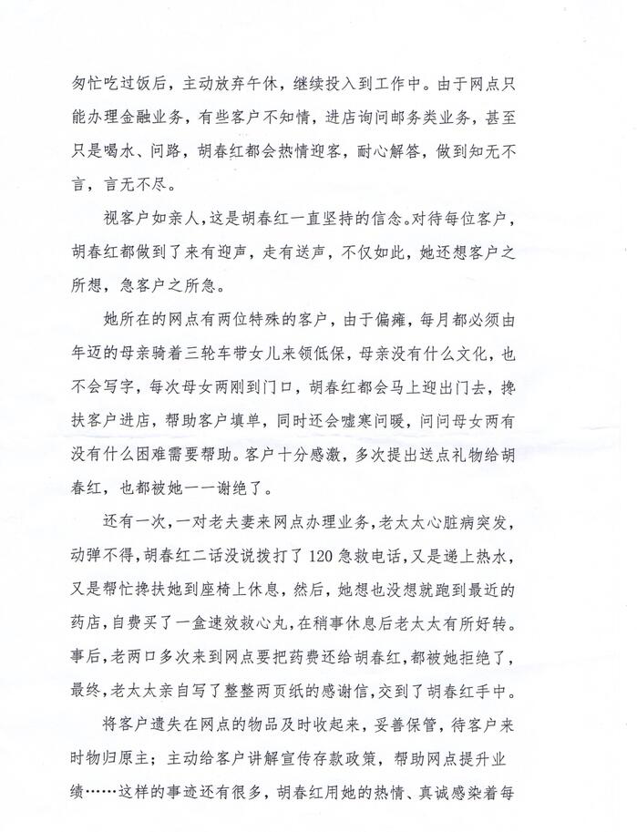 還有一次,一對老夫妻來網(wǎng)點(diǎn)辦理業(yè)務(wù),老大大心臟病突發(fā),動彈不得,胡春紅二話沒說撥打了120急救電話,又是遞上熱水又是幫忙攙扶她到座椅上休息,然后,她想也沒想就跑到最近的藥店,自費(fèi)買了一盒速效救心丸,在稍事休息后老太大有所好轉(zhuǎn)事后,老兩口多次來到網(wǎng)點(diǎn)要把藥費(fèi)還給胡春紅,都被她拒絕了,最終,老大大親自寫了整整兩頁紙的感謝信,交到了胡春紅手中。將客戶遺失在網(wǎng)點(diǎn)的物品及時收起來,妥善保管,待客戶來時物歸原主;主動給客戶講解宣傳存款政策,幫助網(wǎng)點(diǎn)提升業(yè)績……這樣的事跡還有很多,胡春紅用她的熱情、真誠感染著每一位前來辦理業(yè)務(wù)的客戶。翻開客戶意見薄,里面密密麻麻地記載了客戶對于胡春紅的贊美與好評,每當(dāng)想到自已的努力可以真正幫助到客戶,滿滿的成就感就會在胡春紅的心頭漾開,而這也成了她堅持下去的動力。“我在這里上班,我就是這的一份子,我愿意盡我的微薄之力,讓網(wǎng)點(diǎn)辦得更好!”這是胡春紅的心里話,雖然樸實(shí),卻很感人,一如她在這平凡的崗位上,干出的不平凡的成績!